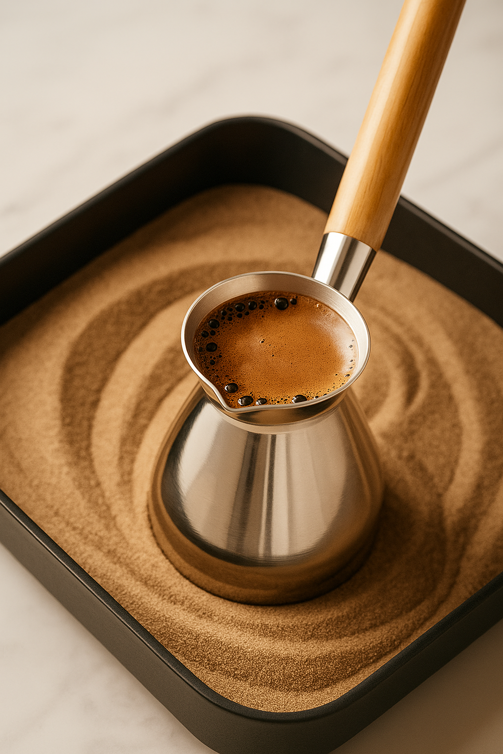 - Add water and sugar (optional) to a cezve (Turkish coffee pot).